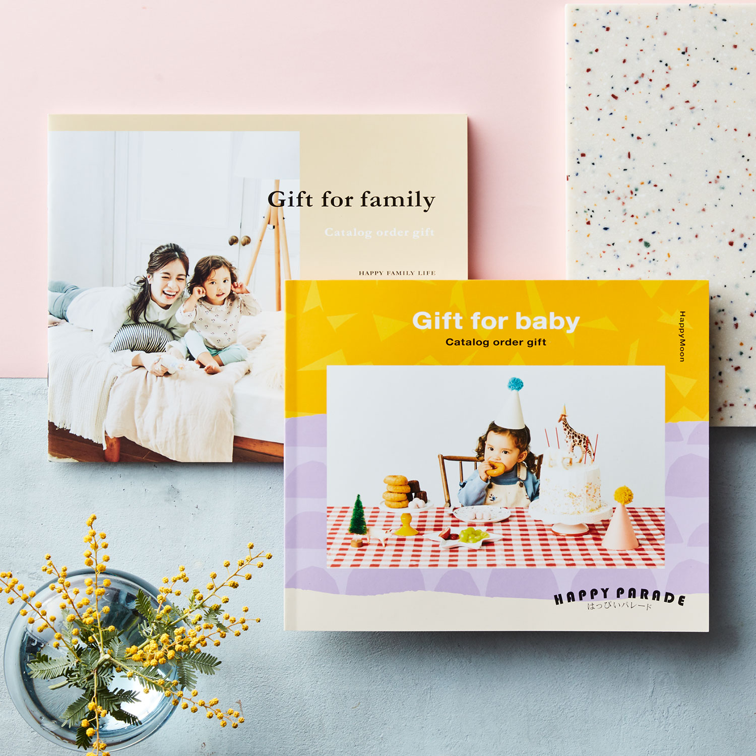 ベビーアイテムを集めたカタログ「Gift for baby]と、出産を経験した家族へのご褒美アイテムを集めたカタログ「Gift for family]の2冊がセットになっているんです。